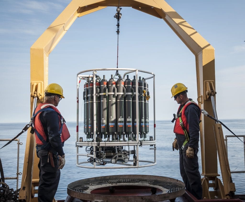 The first Leg of this expedition was dedicated to the Atlantic Zonal Off-Shelf Monitoring Program (AZOMP). This long-term monitoring program led by Fisheries and Oceans Canada in partnership with Amundsen Science and several Canadian universities, including Dalhousie University, University of Manitoba, Université du Québec à Rimouski, University of Alberta, and Université Laval, is centered around the annual survey of the physical, chemical, and biological properties of a long oceanographic transect (named AR7W) running from the Labrador coast to Greenland. No less than 70 oceanographic stations up to 3500 meters deep were visited.